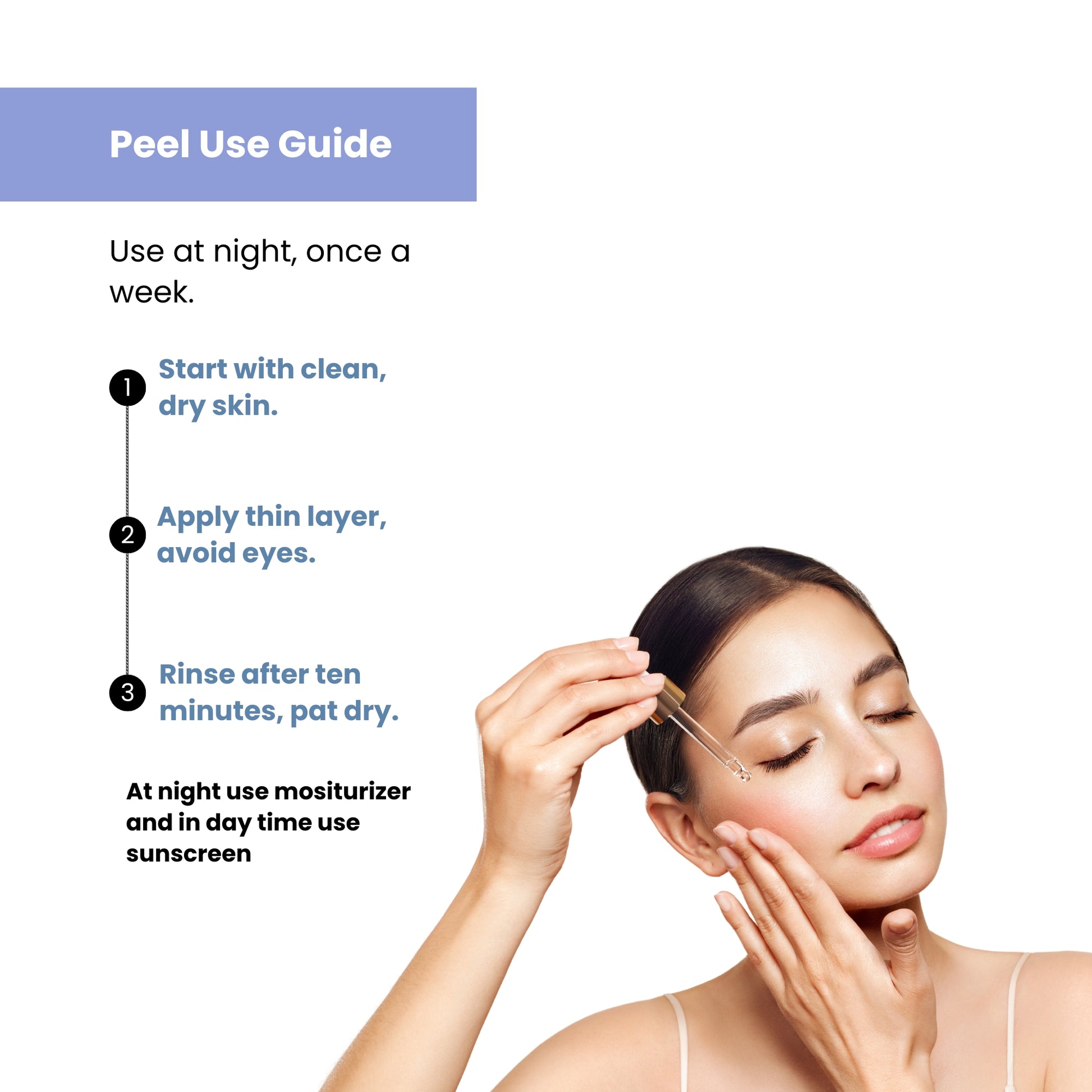 Due to its high strength, you should start by using this solution only once per week in the PM. If your skin develops good tolerance, you can increase the frequency to a maximum of twice or thrice per week, but never exceed the 10-minute application time.